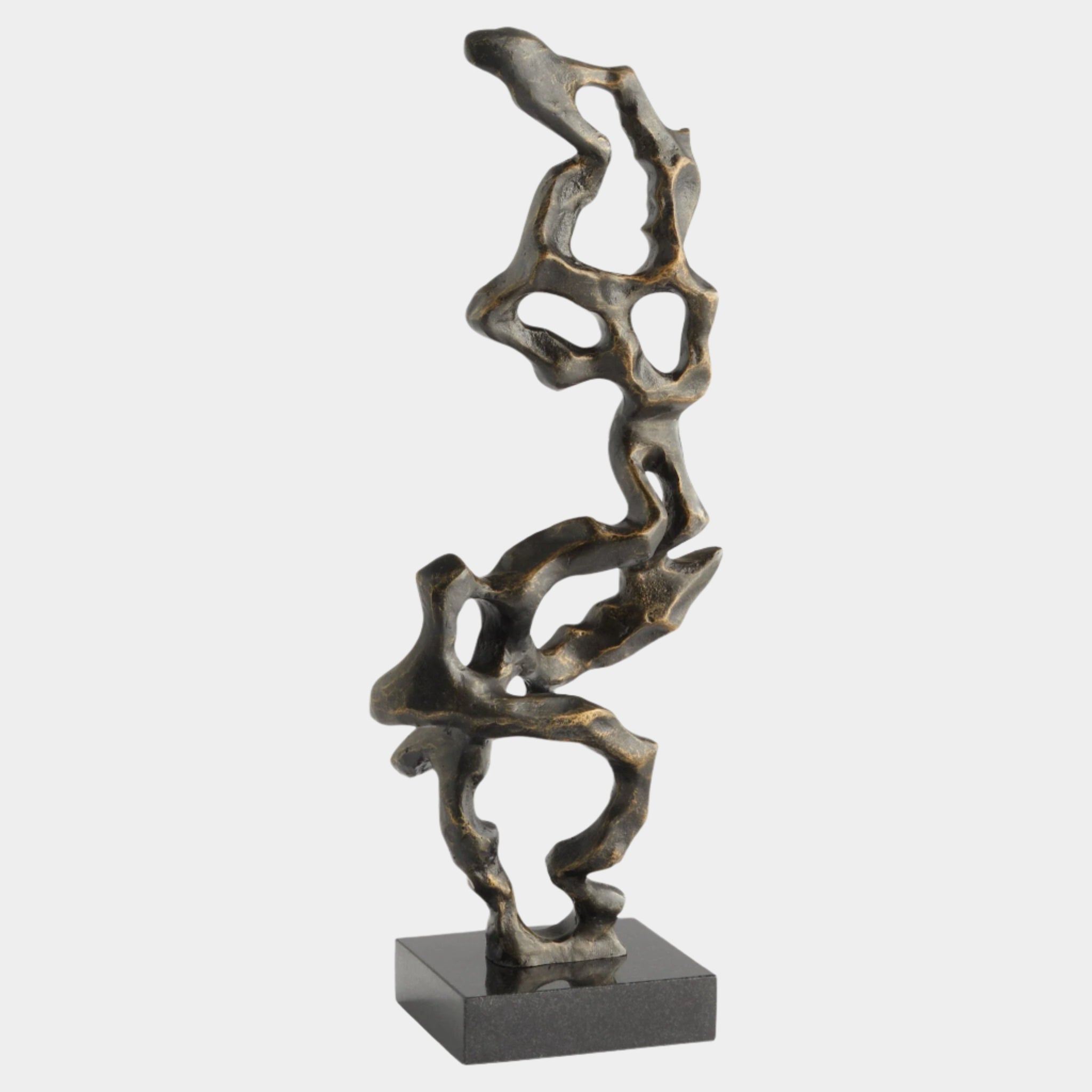 The 12.5" Delos Sculpture combines craftsmanship and artistry with its hand-sculpted design, created through the ancient technique of sand casting. This striking piece features a blend of polished brass and aged bronze finishes, enhanced by a highly textured outer surface that invites tactile exploration. Resting on a black granite base, the sculpture stands as a bold statement in any space, offering both stability and contrast to its intricate details.