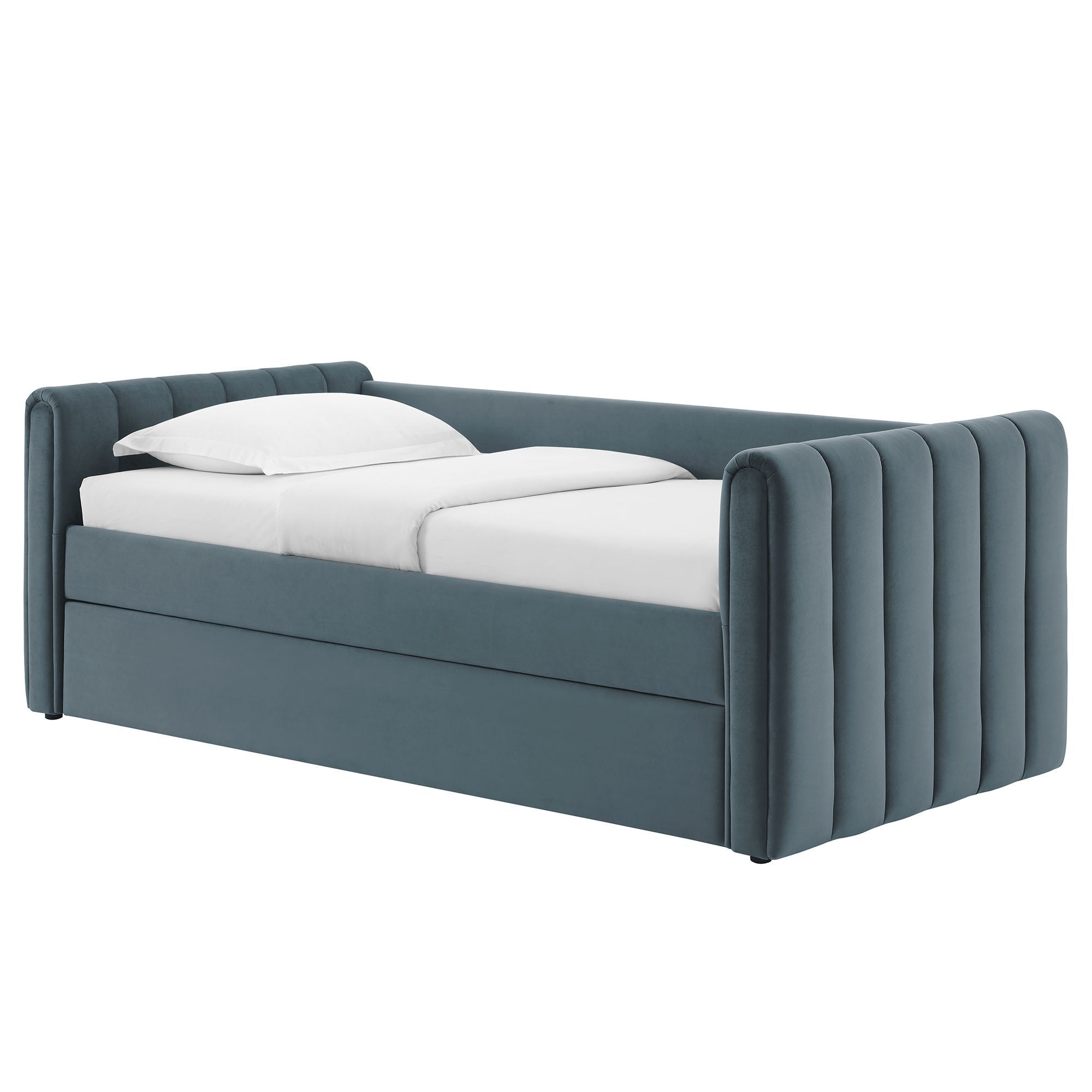 The Veyla Twin Daybed blends sleek form and plush texture with a streamlined silhouette and channel tufted detailing. Upholstered in soft, stain-resistant performance velvet, this twin size daybed with trundle offers a versatile sleeping solution for guest rooms, kids’ bedrooms, or multifunctional living areas. The fully upholstered frame features a low profile, gently padded sides, and tailored vertical channel tufting for a chic look. A hidden pull-out trundle on casters tucks beneath the main bed, creating a seamless twin-over-twin bed layout ideal for overnight guests or everyday lounging. Veyla’s built-in wood slat support system ensures lasting durability without the need for a box spring. Mattress not included. Assembly required. Weight Capacity: 300 lbs.