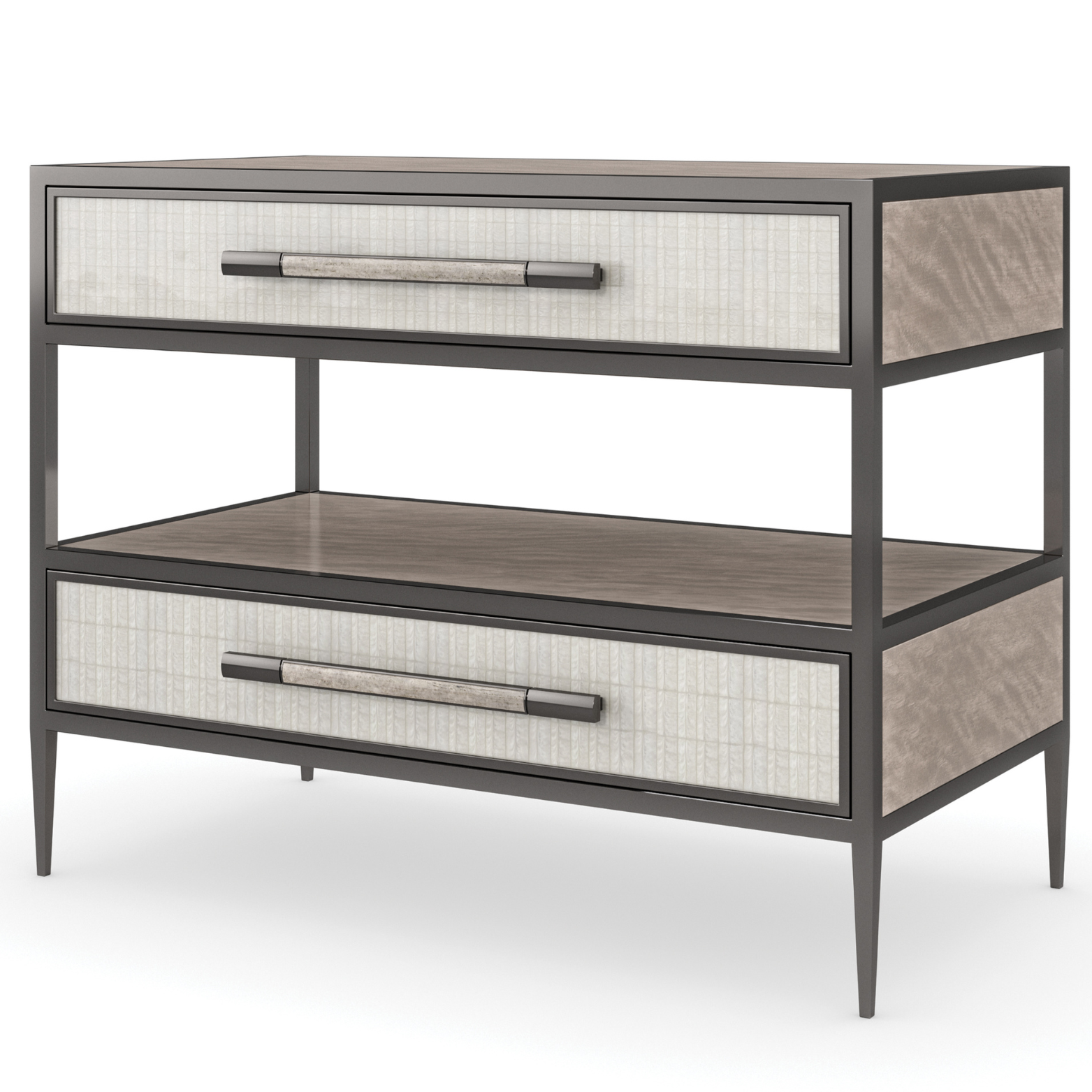 • Asymmetrical, layered drawer design adds sculptural interest