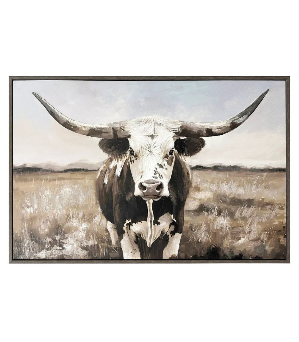 Command attention and capture the rugged beauty of the American frontier with the Midnight Horns wall art by Crestview Collection. This bold photographic portrait spotlights a majestic longhorn bull, its curved ivory horns and dappled black-and-white hide emerging dramatically from a deep black background. The precise lighting and contrast showcase every detail—from the animal’s intense gaze to the sculptural curvature of its horns—creating a sense of power, stillness, and reverence. Encased in clear tempered glass and bordered by a sleek black frame, this piece adds modern sophistication while preserving the raw essence of the wild. Whether displayed in a study, lodge-style retreat, or modern farmhouse, Midnight Horns offers a striking focal point steeped in strength and Western spirit.