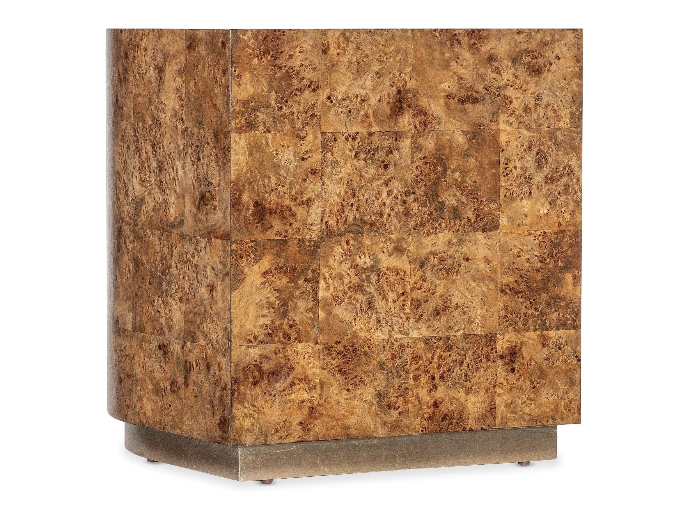 - Mappa burl veneers in a tiled pattern feature a warm golden finish.