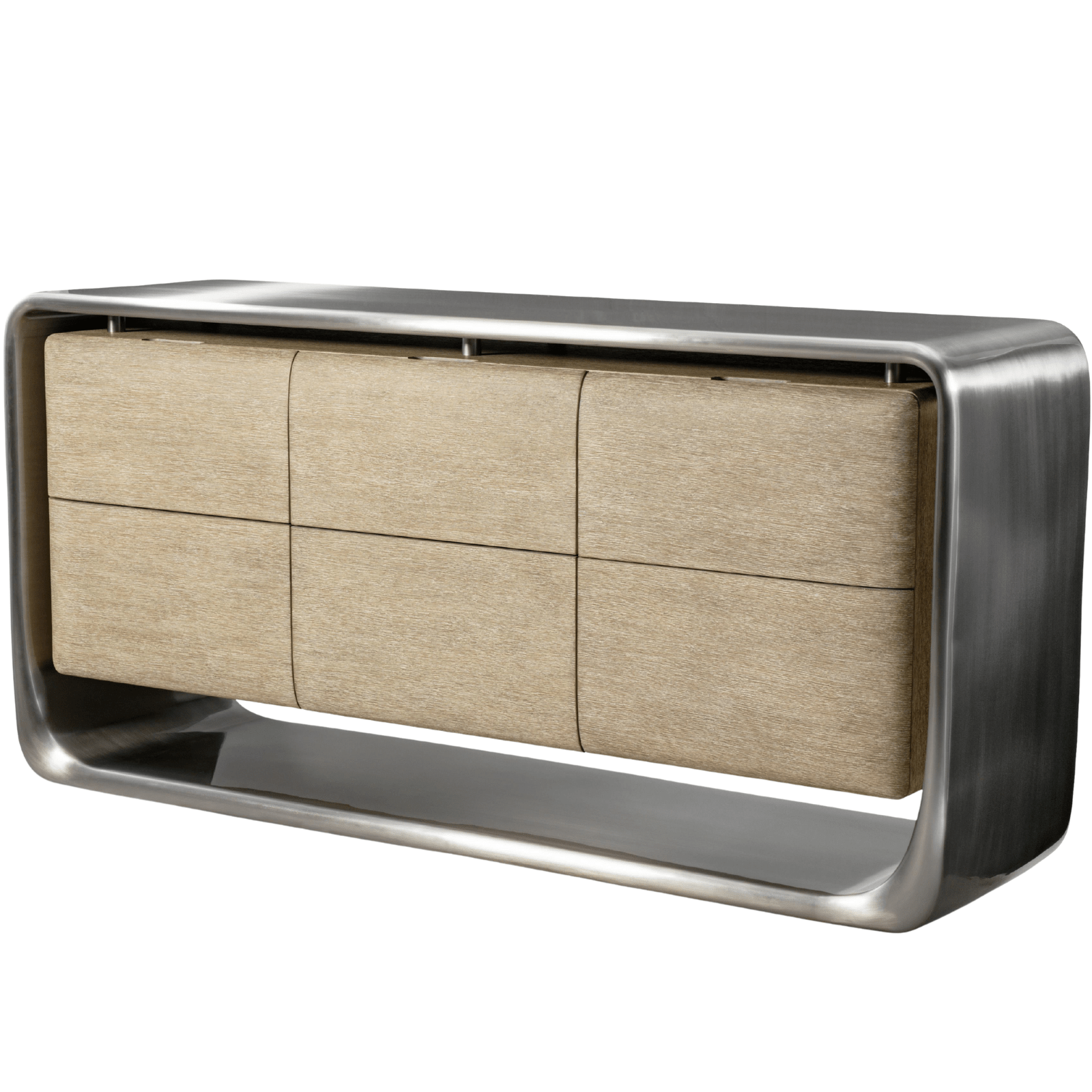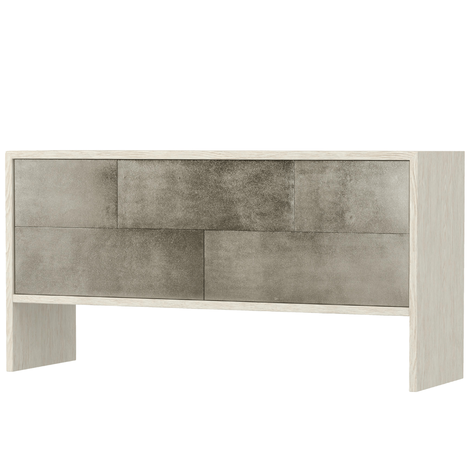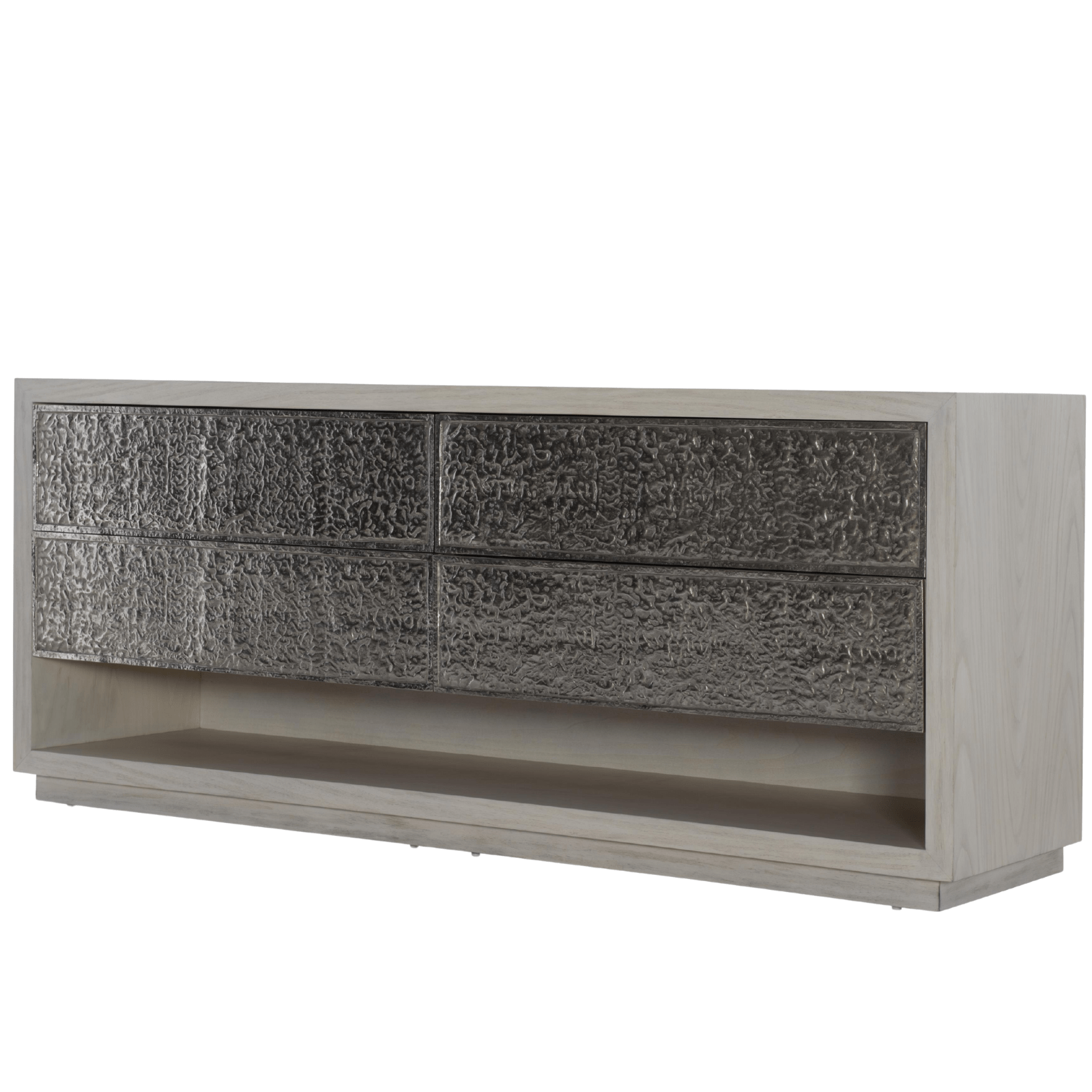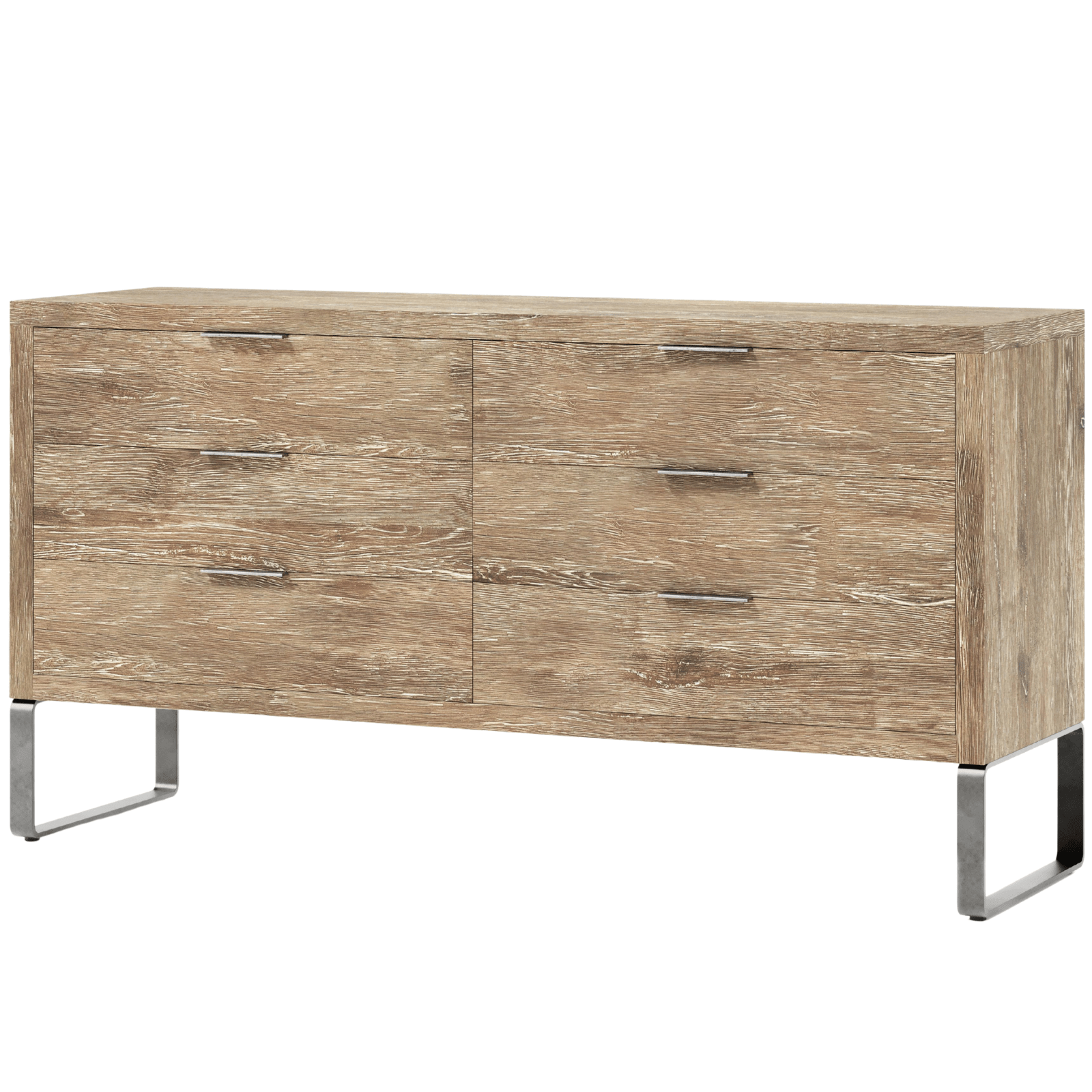 A simple minimalist form combines with the beautiful organic texture of teak for the Calavaras dresser. The design draws all eyes, with its open-work pattern of sliced teak on six push-to-open drawers. Finished in Bleached Teak, the dresser rests on a plinth base.