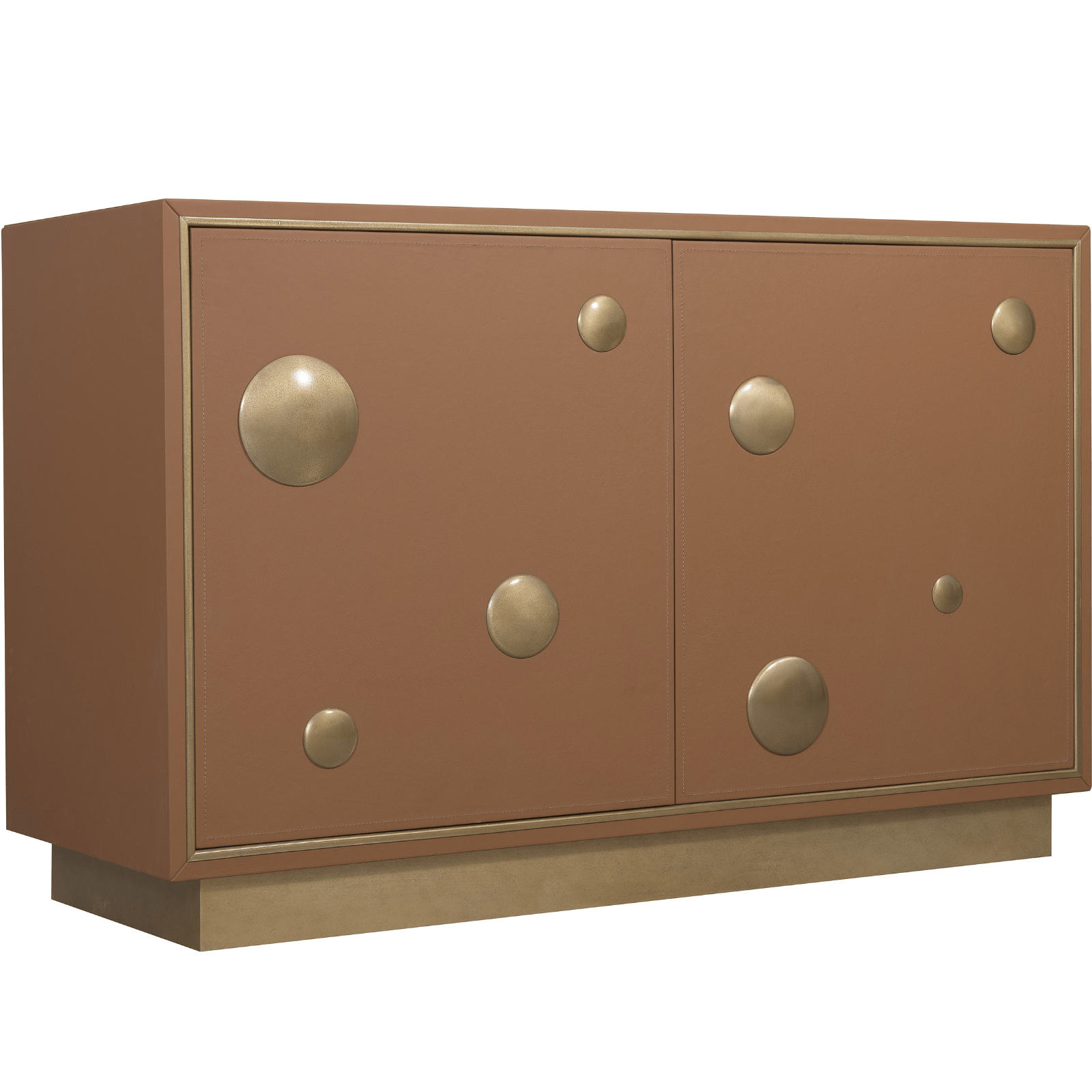 - Three self-closing drawers wrapped with stitched hair on hide leather
